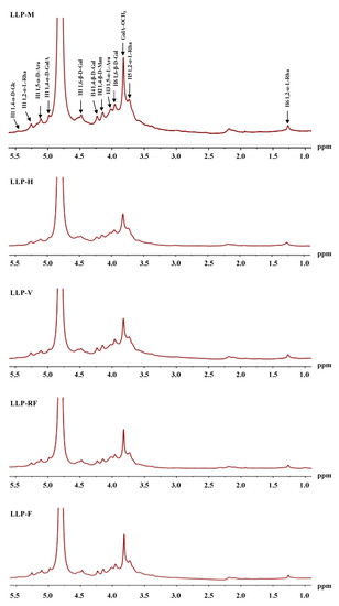 In order to reveal the detailed structural features of LLPs obtained by different drying techniques, the NMR spectra were also recorded to analyze their structural information. As shown in Figure 3 and Figure 4, the 1H and 13C NMR spectra of LLPs obtained by different drying technologies were similar, indicating that drying technologies did not change their backbones (main glycosidic linkages). The 1H signal at 4.80 ppm was assigned to HOD. The signal at 4.98 ppm in the 1H NMR spectra was assigned to the H-1 of 1, 4-α-D-GalA linkage, and its signals of C-1, C-2, C-3, and C-6 were 100.39 ppm, 68.07 ppm, 70.80 ppm, and 170.61 ppm, respectively [18,28]. A very intense signal at 3.82 ppm could be assigned to the methyl ester groups of the GalA carboxyl groups with the signal at 52.81 ppm in the 13C NMR spectra [18]. Signals at 5.26, 3.73, and 1.26 ppm were attributed to the H-1, H-5, and H-6 of 1, 2-α-L-Rha linkage, respectively, and 81.29 ppm was assigned to the C-2 of 1, 2-α-L-Rha linkage [29]. The signal at 4.48 and 3.96 ppm belonged to the H-1 and H-6 of 1, 6-β-D-Gal linkage [18,30]. The signal at 4.23 ppm was assigned to the H-4 of 1, 4-β-D-Gal linkage, and the peaks at 73.18 and 78.93 ppm were connected to the C-2 and C-4 of 1, 4-β-D-Gal linkage [18,31]. The peaks at 5.11 and 4.02 ppm suggested the H-1 and H-3 of 1, 5-α-L-Ara linkage, respectively, with signals at 109.16 and 83.79 ppm were derived from the C-1 and C-2 of 1, 5-α-L-Ara linkage [32], respectively. The signal at 4.16 ppm was derived from the H-2 of 1, 4-β-D-Man linkage, while 76.74 and 60.77 ppm were corresponded to the C-4 and C-6 of 1, 4-β-D-Man linkage [33]. The signals at 5.46 corresponded to the H-1 of 1,4-α-D-Glc linkage [18]. Finally, results suggested that rhamnogalacturonan I (RG I), homogalacturonan (HG), and arabionogalactan might exist in LLPs according to their monosaccharides, FT-IR, and NMR spectra [34].