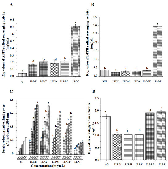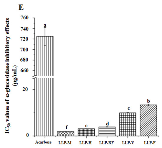 ABTS (A), DPPH (B), and FRAP (C) antioxidant capacities, antiglycation activities (D), and inhibitory effects on α-glucosidase (E) of LLPs.