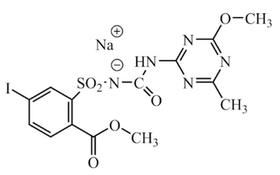 Sulfonylureas are known as selective herbicides, and are extremely effective against abroad spectrum of weeds, e.g., ryegrass, oats, wild radish, fireweed, toad rush, legumes, and a number of other troublesome weeds [5,6,7]. Sulfonylureas are absorbed by the above-ground parts of plants (LIT), and their mechanism of action involves inhibition of the enzyme acetolactate synthase (ALS), which is involved in the biosynthesis of the branched-chain amino acids (BCAAs)—e.g., leucine, valine, and isoleucine [8]. All the above-mentioned features of this class of herbicides make them very popular among farmers. More than 40 sulfonylurea-based compounds have been successfully commercialized since the 1990s. In France, for example, 53 tons of sulfonylurea-based herbicides were used in 1995, and that number has increased nearly fivefold to 246 tons in 2018, while, in Germany, 381 tons were used in 2015. Overall, trends indicate a steady increase in demand for this type of herbicides worldwide [9]. Currently, one of the most effective sulfonylurea-based herbicides globally is sodium salt of iodosulfuron-methyl presented in the Figure 1 [10].