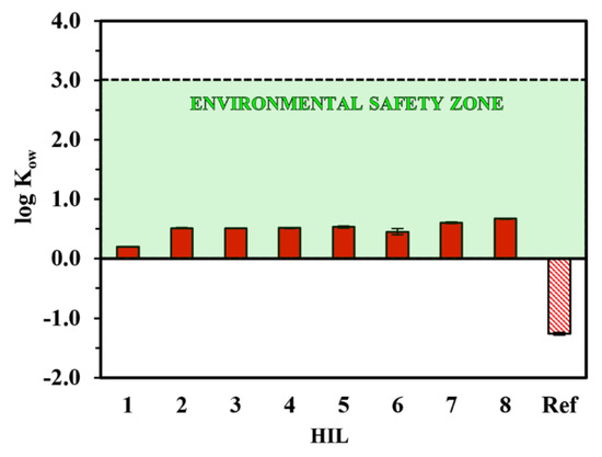 The data collected for both types of cations (alkyltrimethylammonium (1–5) and alkyltrimethylammonium (6–8)) show a trend that the log KOW value gradually increases with the elongation of the alkyl group of the ILs, which corroborates with other reports [7]. Moreover, the increase in alkyl length from tetradecyl (2) to docosyl (5) was negligible. It should be emphasized that the log KOW values for all the synthesized ILs ranged from 0 to 3, indicating their superiority over the currently used form, the sodium salt.
