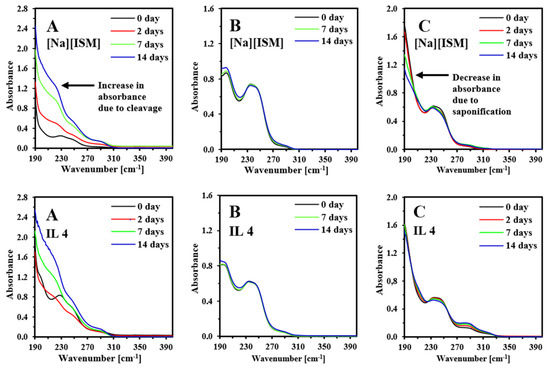 Under neutral conditions (Figure 4B) all samples appeared stable. After 14 days only a slight increase in the first maximum at approx. 190 nm (equal to 7% for sodium salt and less than 4% for ILs) and low decrease in the second maximum at approx. 240 nm (in all cases lower than 2%) were observed. According to the literature, alkaline conditions promote saponification of sulfonylurea, which leads to hydrolysis of the ester bond [2]. In Figure 4C a decrease in the absorbance of the first maximum was observed (by approx. 35% for sodium salt within 14 days), which can be attributed to the hydrolysis of the methyl ester. In the spectra of all ILs, the decrease in absorbance was multiple times lower (approx. 5–7% for 2–4 and 20% for 8), leading to the conclusion that the presence of bulky organic cations in such ILs increases their stability in alkaline environment.