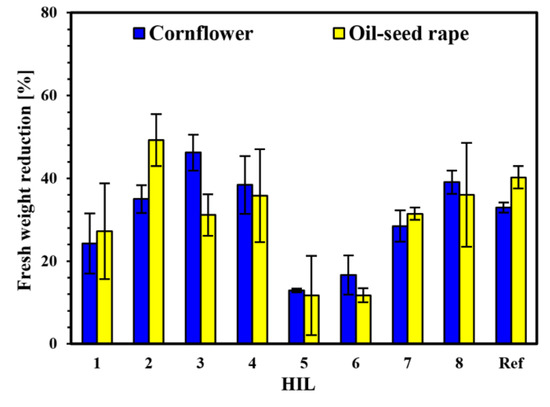 Herbicidal activity of the synthesized HILs (1–8) compared to commercial preparation Huzar 05 WG (Ref) toward cornflower and oil-seed rape.