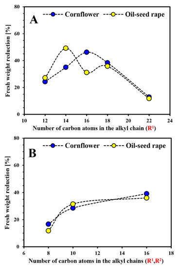 Influence of the alkyl chain length of the obtained HILs 1–5 (A) and 6–8 (B) on the effectiveness of fresh weight reduction of weeds. R1, R2—long alkyl chain.