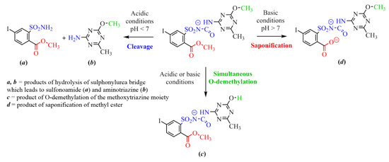 Main routes of hydrolysis of iodosulfuron-methyl anion depending on the pH of the aqueous solution.