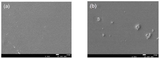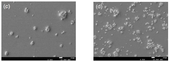 The morphology of CTS/nano-TiO2 nanocomposites observed by SEM was beneficial in evaluating the effects of the composite synthesis process. It can be seen from Figure 1a that the pure chitosan coating is a continuous, smooth and flat single homogeneous system. Figure 1b–d shows that the surface morphology of CTS/TiO2 composite film changes obviously with the addition of different concentrations of nano-TiO2, which is mainly due to the small bumps formed by nano-TiO2 particles embedded in chitosan, which makes the surface of the composite film uneven. When the TiO2 concentration consisted of 0.1% TiO2, some agglomerates were noticeable on the surface. With 0.3% TiO2, more agglomerates covered the surface of the film, and became coarse. However, when the concentration of titanium dioxide is 0.5%, the particles are evenly dispersed in the composite membrane system.