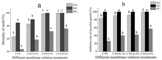 Effect of different concentrations of composite membrane solution on the mortality of mold (a) and inhibition rate of mycelial growth (b). The bars on the columns indicate standard deviation. Different letters indicate significant differences (p < 0.05) within an experiment (marked with letters).