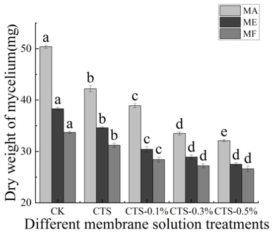 Effect of different concentrations of composite membrane solution on dry weight of mycelium. The bars on the columns indicate standard deviation. Different letters indicate significant differences (p < 0.05) within an experiment (marked with letters).