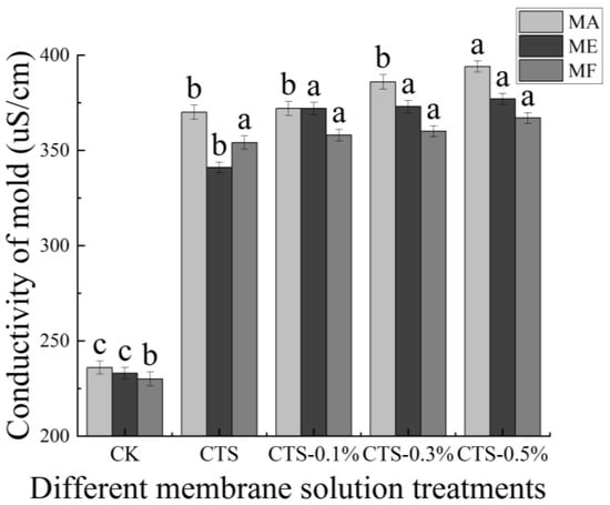 Effect of different concentrations of composite membrane solution on conductivity of mold. The bars on the columns indicate standard deviation. Different letters indicate significant differences (p < 0.05) within an experiment (marked with letters).