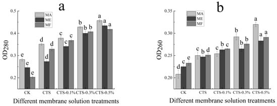 The effects of the CTS/nano-TiO2 composite membrane solution at different concentrations on the rates of protein dissolution in the treated molds are presented in Figure 6a. In the MA, ME and MF the initial absorbance values were 0.282, 0.246 and 0.203, respectively, which increased 0.351, 0.273 and 0.329, respectively, after the single CTS membrane and composite membrane liquid treatments (p < 0.05). Nano-TiO2 is known to increase the rate of fungal protein dissolution, thereby changing membrane permeability. With the increase of nano-TiO2 content in the membrane solution, the light absorption value also increased continuously and significantly in all treated molds (p < 0.05). Because CTS and its composite membrane liquid can destroy the integrity of the cell membrane, thereby increasing its permeability, a large amount of protein is subsequently dissolved in the cell, and the light absorption value, measured at 280 nm, is also increased.