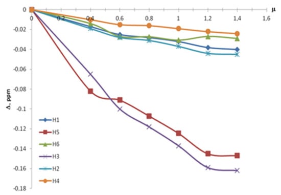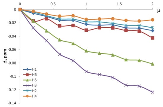 Prior to the studies on the formation of inclusion complexes in mixed solvents, a reference experiment was carried out in D2O solution. It consisted of a series of seven points with the different µ = CBA/Cβ-CD ranging from 0 to 1.4. The observed relative chemical shifts of β-CD are given in Table 1 and Figure 3. Labels H1, H2, H3, H4, H5 and H6 refer to the proton position in a glucopyranose unit of β-CD molecule (Figure 1 and Figure 2).