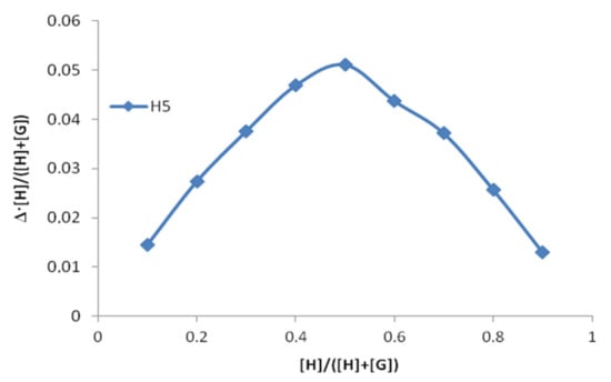 These observations are in satisfactory agreement with the results of our calculations. The pattern in the observable chemical shifts changes for the different host to guest ratio assumes the formation of a 1:1 complex. To prove this hypothesis, an additional experiment using Job’s method of continuous variation was carried out. It is the simplest and most intuitive method to prove the stoichiometry when only one type of the complex is formed [14,15,16]. The Job’s plot for the [BA⊂β-CD] system is shown on Figure 4. Maximum at the point [H]/([H] + [G]) = 0.5 confirms the 1:1 complex formation.