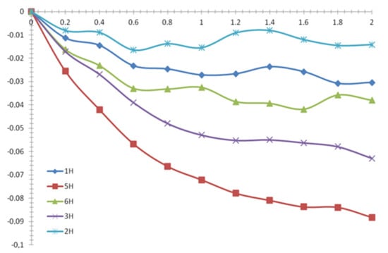 A preliminary series for X(DMSO-d6) = 0.24 mol. fr. showed no changes of protons chemical shifts both for β-CD and BA. The maximum change observed for H5 was 0.01 ppm that is within the experimental error. In a series with a molar fraction of 0.15 the statistically significant changes of chemical shifts were observed, but the processing of this data gave unreliable results. Therefore, this series was excluded from further investigation and only series with molar fractions of DMSO-d6 equal to 0.05, 0.075 and 0.10 were included. The series with X(DMSO-d6) = 0.075 mol. fr. was carried out in an extended range of BA-β-CD ratio from 0.2 to 2.5. All the raw data on 1H chemical shifts for all treated series are given in the Supplementary Materials except for the NMR titration curves for X(DMSO-d6) = 0.05 mol. fr. presented below (Figure 5).
