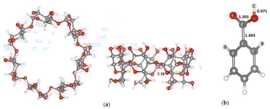 The optimized structures of β-CD and BA obtained with the GFN2-xTB method are presented in Figure 8. As for the β-CD structure, the outer diameters range from 13.33 to 14.36 Å, while the inner diameter was found to be 7.78 Å, which is in good agreement with the literature [17].