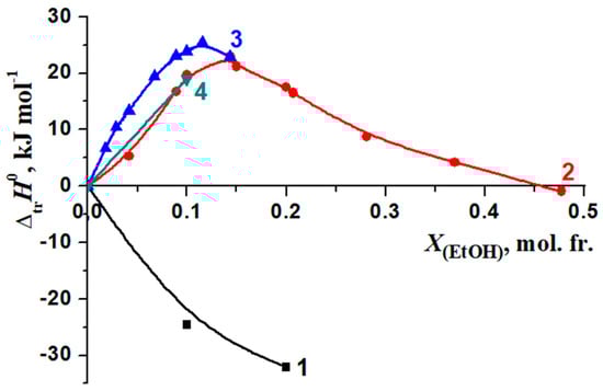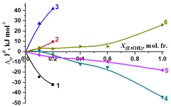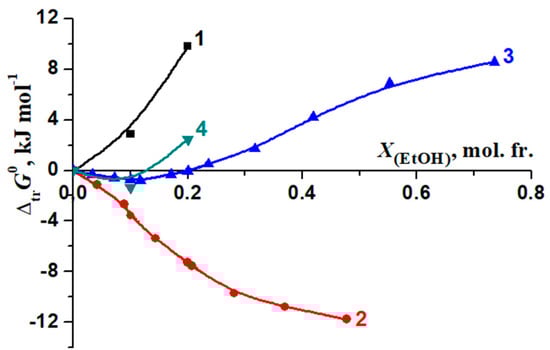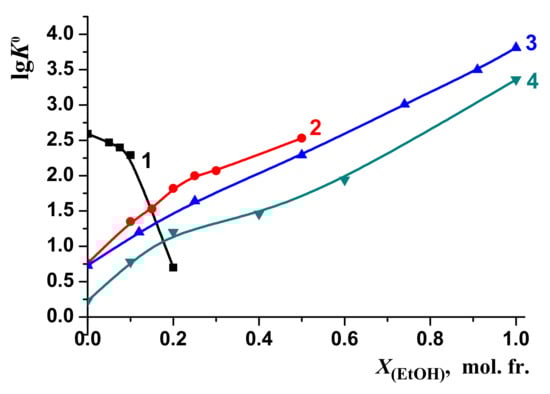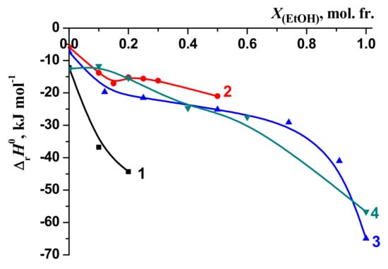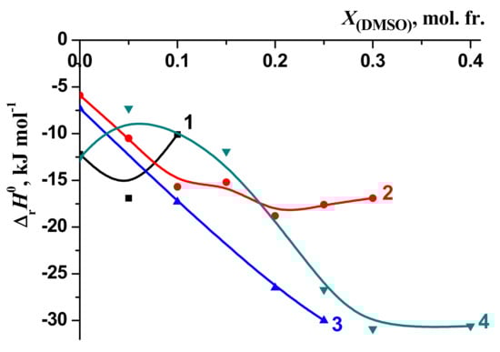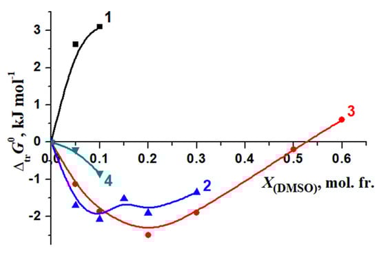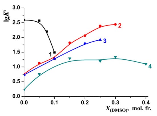 The ranges of the molar fractions of DMSO and EtOH in water–organic solvents were limited due to the lowest complex stability in mixed solvents than in water and hence making it impossible to calculate reliable thermodynamic parameters for [BA⊂β-CD] molecular complex in mixed solvents with high concentration of DMSO or EtOH. Despite these limitations, the obtained results allowed to analyze the effect of the cosolvent on the change in the thermodynamic parameters of the reaction (1).