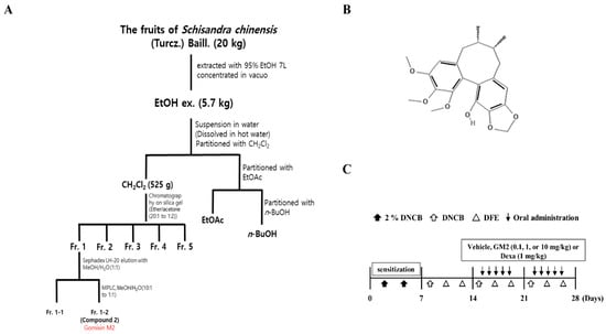 Isolation scheme, structure of GM2, and experimental scheme of AD induction. (A) Schematic diagram of GM2 isolation of the bioactive compounds from Schisandra chinensis (Turcz.) Baill. (Schisandraceae). (B) Chemical structure of GM2. (C) Experimental scheme for AD induction to application 2,4-dinitrochlorobenzene (DNCB) and Dermatophagoides farina (DNCB/DFE) and oral administration of gomisin M2 (GM2) or dexamethasone (Dexa).