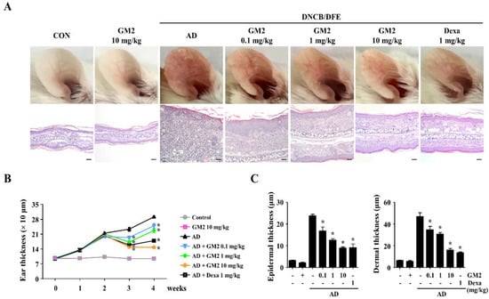 A total of 35 mice were divided into seven groups (n = 5): vehicle (PBS), GM2 10 mg/kg, DNCB/DFE and vehicle (PBS), DNCB/DFE plus GM2 (0.1, 1, or 10 mg/kg), or DNCB/DFE plus Dexa 1 mg/kg. During the first week of induction, DNCB (2%, 20 μL/ear) was applied onto each ear twice for sensitization. Then, DNCB (1%, 20 μL/ear, once) and DFE (1 mg/mL, 20 μL/ear, twice) were applied to both BALB/c mouse ears for three weeks. After two weeks, GM2 (0.1, 1, or 10 mg/kg) or Dexa (1 mg/kg) were orally administrated by gavage for five consecutive days per week for two weeks.