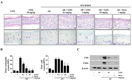 Swelling is caused by the infiltration of inflammatory cells that are involved in a hyperkeratosis, parakeratosis, and acanthosis [3]. Therefore, in order to analyze the effects of GM2 on the inflammatory cell infiltration in the ear tissue, they were stained with hematoxylin and eosin (H&E) and toluidine blue (TB). The infiltration of the tissue eosinophils was assessed by H&E-staining and mast cells were observed with TB-staining in AD lesions. In the DNCB/DFE-induced AD mice, the infiltration of the tissue eosinophils and mast cells in the AD lesions was observed; however, oral administration of GM2 resulted in a reduction in those infiltrations (Figure 3A,B). During the pathologic process of skin, CD44 is expressed on keratinocytes membranes and the infiltrating lymphocytes near the inflammation localization or tumor localization [19,20]. Therefore, in order to confirm the role of GM2 on cell infiltration, we evaluated the expression of CD4 and CD44 in the ear tissues of DNCB/DFE-induced AD. Oral administration of GM2 (10 mg/kg) suppressed the expressions of CD4 and CD44 in the AD-like skin (Figure 3C).