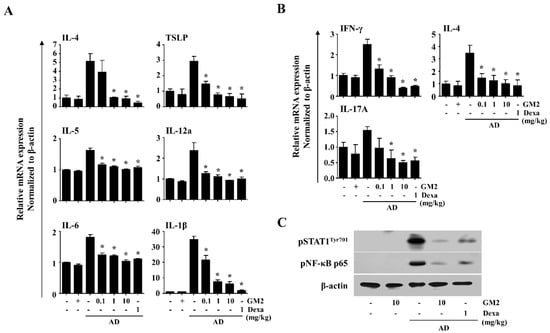Effects of GM2 on the inflammatory mediator response in AD mice. (A) qPCR was used for the measurement of AD-related cytokines in AD-like skin lesions. (B) AD-related cytokines were measured by qPCR in the auricular lymph node of AD mice. Data presented in the graph represents the means ± SEM (n = 5). * p < 0.05, compared with the DNCB/DFE-induced group. (C) The activation of STAT1 and NF-κB phosphorylation were analyzed by Western blot in AD-like skin lesions. β-actin was used as a loading control and blots used independent blots from randomly selected three of ear tissues per each group. Dexa: dexamethasone.