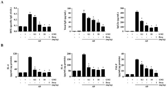 Effect of GM2 on the levels of sera immunoglobulin and tissue extracts of AD mice. Blood samples were collected from the abdominal vena cava and ear tissue samples were removed per mouse from each group on day 28. Each graph demonstrates the levels of DFE-specific IgE, total IgE, and IgG2a in serum (A) and the levels of IL-4, IL-6, and TSLP proteins in ear tissue extracts (B) were determined using ELISA. Data presented in the graph represents the means ± SEM (n = 5). * p < 0.05, compared with the DNCB/DFE-induced group. Dexa: dexamethasone.