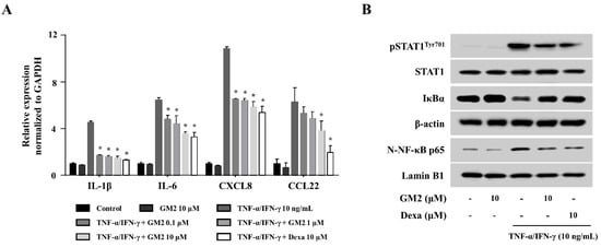 Keratinocytes (HaCaT cells) were utilized to confirm the role of GM2 in vitro. First, the cytotoxicity of GM2 was evaluated using an MTT assay. GM2 did not show cytotoxicity up to 10 μM (Figure S2). Therefore, subsequent in vitro assays utilized GM2 up to a concentration of 10 μM. GM2 (0.1, 1, or 10 μM) decreased the expression of the inflammatory cytokines (IL-1β and IL-6) and the chemokines (CXCL8 and CCL22) in comparison to the tumor necrosis factor (TNF)-α/IFN-γ-stimulated HaCaT cells (Figure 6A). STAT1 and NF-κB are important transcription factors that regulate the expression of those inflammatory mediators [21,22]. In order to evaluate the responsible mechanisms in the reduction in cytokine/chemokine, we assessed the effects of GM2 on the activation of STAT1 and NF-κB p65. GM2 suppressed the phosphorylation of STAT1, degradation of IκBα, and nuclear translocation of NF-κB p65 in the TNF-α/IFN-γ-stimulated HaCaT cells (Figure 6B).