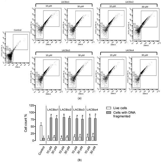 LACBio1, LACBio2, LACBio3 and LACBio4 caused DNA fragmentation in MDA-MB 231 cells. Cells were treated with compounds for 24 h. Representative data obtained by cytometric analysis are shown in (a), and cell counts are shown in (b) (in %). All the values are presented as the mean ± standard error of three independent experiments. Statistical analyses were performed in GraphPad Prism 8.02 and included one-way ANOVA with Dunnett’s post hoc test, and statistical significance was defined as * p < 0.05.