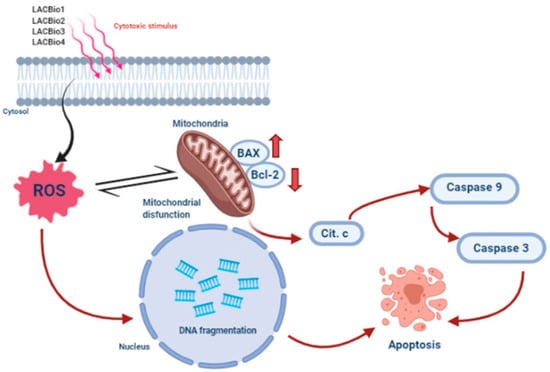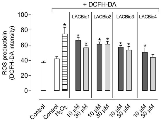Effects of LACBio1, LACBio2, LACBio3 and LACBio4 on ROS generation by MDA-MB 231 cells. ROS were assayed through the 2′,7′-dichlorofluorescein diacetate (DCFH-DA) method. The results are presented as the mean ± standard error of three independent experiments. Statistical analyses were performed with GraphPad Prism 8.02 software and included one-way ANOVA followed by Dunnett´s post-test. Statistical significance was defined as * p < 0.05 when compared with the control group.