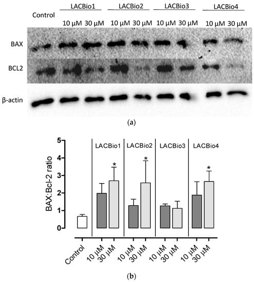 LACBio1, LACBio2 and LACBio4 caused an increase in the Bax:Bcl-2 ratio. In (a), representative Western blotting shows the expression levels of Bax, Bcl-2 and β-actin. In (b), densitometric analysis was used to determine the Bax:Bcl-2 ratio. All the values are represented as the mean ± standard error of three independent experiments. Statistical analyses were performed with GraphPad Prism 8.02 and included one-way ANOVA followed by Dunnett´s post hoc test. Statistical significance was defined as * p < 0.05 when compared with the control group.