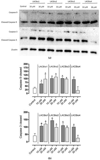 LACBio1, LACBio2, LACBio3 and LACBio4 activate the intrinsic caspase cascade. (a) Representative Western blots showing levels of expression of caspase 9, caspase 3 and β-actin. (b) Bar graph showing arbitrary unit changes in level of cleaved caspase 9 and 3. All the values are represented as the mean ± standard error of three independent experiments. Statistical analyses were performed using GraphPad Prism 8.02 and included one-way ANOVA with Dunnett´s post -hoc test. Statistical significance was defined as * p < 0.05 when compared with the control group.