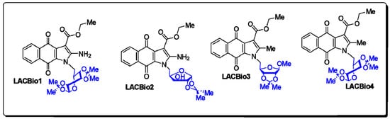 The compounds LACBio1, LACBio2, LACBio3 and LACBio4 investigated in this work were synthesized as previously described by Dias and colleagues []. The synthesis of the compounds LACBio1 and LACBio2 involved the reaction of halo-naphthoquinones containing a carbonyl group with amino carbohydrates. The compounds LACBio3 and LACBio4 (Scheme 1) were prepared by a cerium(IV)-mediated oxidative free radical cyclization reaction between 1,4-amino-naphthoquinones, which possess an aminocarbohydrate chain at the C-2 position of the quinone ring, and ethyl acetoacetate [].