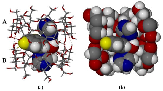 β-CD, a prominent member of the native (natural/underivatized) cyclodextrins, is a cyclic oligosaccharide composed of seven α-1,4-linked D-glucopyranose units, frequently employed as a complexing agent to solubilize hydrophobic guest molecules [8,9]. Depending on the size of the latter, the central apolar cavity of the β-CD molecule can accommodate either an entire lipophilic guest molecule or a sizeable guest residue. On the other hand, the periphery of the toroidally shaped macrocycle features seven hydroxyl groups located on its narrower (primary) rim and fourteen hydroxyl groups on its wider (secondary rim), these functional groups rendering the host–guest complex relatively soluble in water. The use of CDs as vehicles for the delivery of poorly soluble APIs is a major research topic in the fields of supramolecular chemistry and pharmaceutical development. Reports of resulting improvements in drug bioavailability and the enhancement of other pharmaceutically relevant properties abound [10,11,12].