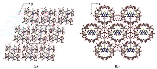 In TBCDFLU, the complex units are arranged in the IM (“intermediate”) packing type [25,26] (Figure 5a), characterized by a lateral shift of successive complex layers, such that the primary sides of each dimer are blocked by two neighboring dimeric complexes in the layers above and below. Instead, the complex units in MBCDFLU are assembled in CH (“channel”) packing mode [25,26]. Figure 5b shows the view parallel to the channels.