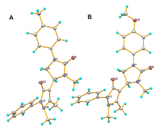 Molecular structure of the compounds 2j (A) and 2k (B). Ellipsoids are given with a 50% probability.