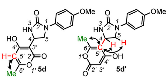 Interestingly, the reaction of the urea 1d with 4-hydroxy-6-methylpyran-2-one resulted in the mixture of regioisomeric 4-(2-oxopyran-3-yl)- and 4-(2-oxopyran-5-yl)imidazolidinones 5d and 5d′ (~10:1 molar ratio according to NMR data). The structure of regioisomers was unequivocally determined by 1H-13C HMBC experiments (Figure 4). Thus, in compound 5d, a cross-peak is observed between the protons of the methyl group of the pyran-2-one fragment and 5′-C carbon atom, which is bonded to hydrogen. At the same time, in the compound 5d′, the cross-peak between the protons of the same methyl group and the substituted 5′-C carbon atom is present (see Supplementary Materials, Figure S98, for the HMBC spectrum). Additionally, there are cross-peaks between the 5′-C carbon atom and protons of the methyne (4-CH) and methylene (5-CH2) groups of the imidazolidin-2-one ring.