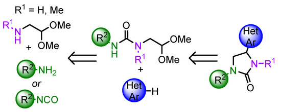 Nitrogen-containing aldehydes and acetals are widely used in the heterocycles synthesis [14,15]. Earlier, we have described the approach to 2-substituted pyrrolidine derivatives based on the in situ generation of a cyclic iminium ion from 4-aminobutanal acetals (4,4-diethoxybutan-1-amines) and its trapping by various nucleophiles [16,17,18]. Our preliminary studies indicate that N-(2,2-dialkoxyethyl) ureas are also capable of the formation of cyclic imidazolinium cations and the reaction results in cyclic urea derivatives—imidazolidinones or benzo [d] [1,3] diazepinones [19]. As the continuation of our efforts, herein, we report the successful application of this methodology to the synthesis of the series of 4-(hetero) arylimidazolidin-2-ones starting from N-(2,2-dialkoxyethyl) ureas and (hetero) aromatic nucleophiles (Scheme 1). The main advantages of the described method are the mild reaction conditions, good to high product yield and the high regioselectivity. Notably, N-(2,2-dialkoxyethyl) ureas are easily accessible from commercially available 2,2-dimethoxyethan-1-amine and amines or isocyanates in just one step, which also adds value to the proposed approach. Some considerations on the regioselectivity of the reaction are discussed based on quantum chemistry calculations, as well as evaluation of the in vitro anti-cancer activities of the obtained compounds.