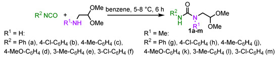 We initiated our studies with the expanding the scope of the starting N-(2,2-dialkoxyethyl) ureas 1 (Scheme 2). Di- and trisubstituted ureas possessing various aryl (1a–f) and aryl/alkyl (1g–m) groups were easily obtained from appropriate isocyanates by known procedures [20].