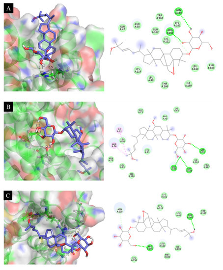 We demonstrated the docking of the active metabolites and SB203580 into 2L3Y protein (Figure 2) using the PyRx 0.9.4 virtual screening software. Table 2 shows the docking score energy and root-mean-square deviation (RMSD) between the active compounds and protein with various interactions, including hydrogen bond interactions and the interaction distances between amino acids and the active sites. From the docking results, compounds 3, 4, 6, 11, and 12 had binding energies of −7.18, −7.48, −7.26, −6.99, and −6.41 kcal·mol−1, respectively. The corresponding ligand interactions of 3 and 4 with 2L3Y protein were hydrogen bond interactions between the enzyme residues and the hydroxyl groups in the sugar rings of the two compounds (Figure 3). As illustrated in Figure 3C, the ligand interactions of 6 with the IL-6 protein involved four hydrogen bonds with Lys156, Thr166, Arg165, and Asn109 with bond distances of 2.3, 2.0, 2.6, and 2.3 Å, respectively. These interactions corresponded to the hydrogen-bonding interactions between the enzyme residues and hydroxyl groups in both sugar rings and position C-25. Interestingly, the activities of compounds 11 and 12 were interpreted as hydrogen bonds with residues Lys137 and Asn133, respectively, with bond distances of 2.3 Å (Table 2). The corresponding ligand interactions of 11 and 12 with the protein involved hydrogen bonds between the enzyme residues and hydroxyl groups at C-25 and C-3, respectively (Figure 3). These findings suggest the important roles of the hydroxyl groups at positions C-3 and C-25 as well as the sugar rings in inhibition of IL-6 expression.