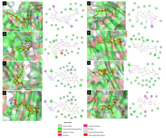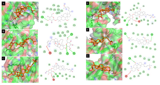The interactions of 4, 6, and 9 with the TNF-α protein involved hydrogen bonds between enzyme residues and the hydroxyl groups in both sugar rings (Figure 5). As illustrated in Figure 5A, compound 4 formed three hydrogen bonds with the residues Tyr59, Gln125, and Gly121 with bond distances of 2.1, 2.5, and 2.2 Å, respectively. Compound 6 formed two hydrogen bonds with Leu55 and Gln125 of the 2AZ5 protein with bond distances of 2.4 and 2.7 Å, respectively (Figure 5B). Compound 9 formed a hydrogen bond with Gly121 with a bonding distance of 2.4 Å (Figure 5C). Compound 11 formed two hydrogen bonds between the hydroxyl group at C-25 and residues Ser95 and Gln125 with bond distances of 2.6 and 2.1 Å, respectively (Figure 5D). Compound 12 formed three hydrogen bonds between a hydroxyl group at C-25, oxygen in the methoxy group at C-25, and oxygen in the aldehyde group at C-19 and the residues Tyr151, Tyr59, and Leu120 with bond distances of 2.3, 2.2, and 2.6 Å, respectively (Figure 5E). The activity of compound 13 was based on bonding between a hydroxyl group at C-3 and oxygen in the methoxy group at C-25 and residues Gly121, Leu120, and Ser60 with bonding distances of 2.3, 1.9, and 2.5 Å, respectively (Figure 5F). Compound 14 formed a single bond between the hydroxyl group at C-25 and residue Tyr119 with a bond distance of 2.3 Å (Figure 5G). This demonstrates the roles of the hydroxyl groups at both C-3 and C-25, and the sugar rings, methoxy group at C-25, and the aldehyde group at C-19 in the inhibition of TNF-α expression.