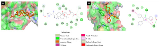 Discovery Studio Client was used for the analysis of the interactions between the compounds and target protein, and the performance of interaction on 2D and 3D planes. Various interactions, such as hydrogen bonds, van der Waals interactions, π–anion bonds, π–π bonds, and the interaction distance between amino acids and the active sites of compounds were plotted. Van der Waals interactions are detected by contact with hydrophilic and hydrophobic surfaces between the compounds and their bonding point.