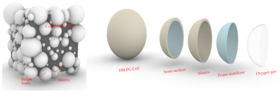 In the preparation process, the dry materials will be intimately mixed, and then the water will be added into the mixed dry materials and stirred for 2 min. Lastly, the prepared hydrogen peroxide will be put into the mixed materials and stirred for 30 s, and the slurry FBLPG is prepared. Then the slurry will be put into the mold to wait for the foaming process. When the slurry is in the process of foaming, under basic conditions, the hydrogen peroxide is decomposed into oxygen, which leads to bubbles of large and small sizes randomly distributed in the slurry. The size and the distribution of the bubbles are affected by the stirring result of the slurry. The slurry FBLPG is made up of materials of three physics states, which are respectively solid, liquid and gas. The picture of the ideal structure model of the slurry is shown in Figure 1. To establish this structure model, the sample was incised, and the pore structure data were obtained by binarization processing of the profile, including pore quantities, size and distribution, and this structure data obtaining method can be found in the work of Xiong in 2019 [20]. All the data were employed by Rhino 6.0 to establish this model. The outer layer is the matrix, and the porous structure in the inner wall is full of bubbles. There is calcium stearate powder of very small size between the outer layer and the inner wall, keeping the pore structure stable.