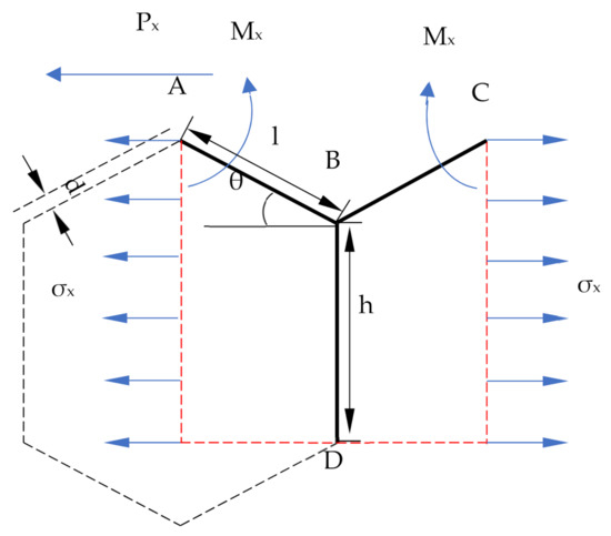 The pore structure of the FBLPG can be considered as the unit structure of the hexagon, which is an independent unit cell of the honeycomb structure. This study analyzes the force in the hexagonal structure of the unit cell through parameter calculation of the mechanical properties, for the purpose of studying the bearing capacity and stability of light-weighted porous materials. The model made by Fu and Zhao is used to achieve the purpose [30,31]. The force model for the bore walls of the hexagon honeycomb structure is a simplified Y model, as shown in Figure 4. Considering the stress in the x and y direction, the force matrix and the balanced state, the elastic modulus and the Poisson’s ratio holding a large influence on the FBLPG deformation are calculated. Here, this paper will only present the calculations of the mechanical parameters based on the stress in the x direction and its torque. Since the calculation based on the force in the y direction is similar to that in the x direction, the calculating results will be given without presenting the calculating process.