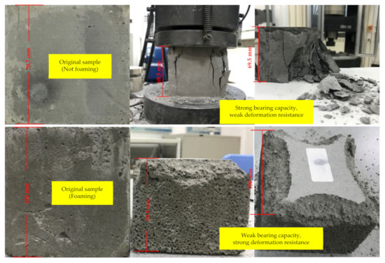To study the bearing capacity of FBLPG, the universal testing machine of type WDW-300 is used in the uniaxial compressive strength test with invariable displacement loading speed. The fly-ash-based geopolymer sample that is not foaming is cast in a rectangular mold of 70.7 mm, while the FBLPG sample is cast in a rectangular mold of 100 mm. The details on the testing process are shown in Figure 5. In the test, it can be easily observed that the fly-ash-based geopolymer sample that is not foaming shows regular damage form as in rock and concrete. It seems to have a strong bearing capacity, up to 20 MPa, even though it shows a weak deformation resistance. When it reaches the yielding limit, distinct cracks arise in the sample and then it gets collapsed. However, there are few cracks appearing in the FBLPG sample, and only a small collapse arises at the end of the channels. There was a great deformation in the whole sample.