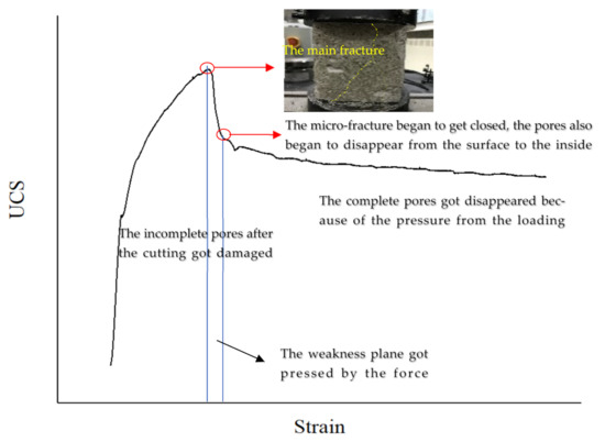 This phenomenon is closely related to the unique hexagon honeycomb structure of FBLPG. The loading procedure of FBLPG consists of three main stages, as is shown in Figure 7. In the first stage, after the cutting, the incomplete pores were damaged first. As the FBLPG surface began to come in contact with the head of the testing machine, the incomplete pores in the surface began to get pressed and gradually collapsed. In this stage, the whole FBLPG sample remained elastic for a short period. In the second stage, the weakness plane was pressed by the force. The weakness plane in the structure and the pore were damaged, resulting in the main fracture. With the loading going on, the micro-fracture began to get closed due to the increasing pressure from the loading. The pores also began to disappear from the surface to the inside. In this stage, the complete pores disappeared because of the pressure from the loading. However, the deformation increased gradually, and there was a very small change in the pressure values. The part of the sample that was on the edge of the roof and the bottom got in contact with the testing machine and got damaged due to the stress concentration. In the plugging of the end, the deformation resistance of FBLPG was the main factor contributing to the plugging effect instead of its bearing capacity. That is to say, it is the plastic yielding performance of FBLPG that plays an important role in the application of FBLPG in the plugging of the end, which will not produce the brittle failure leading to big air leakage channels. Instead, it will only get gradually deformed with the falling of the roof, which can effectively plug the end in the working face.