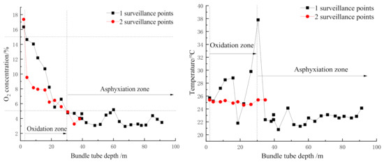 Based on the concept of in-situ utilization of fly ash generated in the power plant, the fly ash generated in the power plant of the Dananhu number one coal mine was used to prepare FBLPG, which was applied in the plugging operation in the 1305 working face. According to the determination report on the period of spontaneous coal combustion in this area, CO is the first gas product that appears in the oxidizing process of coal and exists through the whole oxidizing process. Therefore, CO was selected as the first important sign for the spontaneous coal combustion, with its quantity variation and changing rate as indicators for the prediction of the spontaneous combustion trend. As the testing results show, the coal seam mined in this area belongs to a spontaneous combustion seam of type I, with the shortest spontaneous combustion period of 37 days. After the mining of the coal seam, there were a lot of residual coals left in the mined-out areas, and these residual coals exposed to the air would be gradually oxidized, producing a large quantity of CO. As a result, the environment of the working face would be polluted by the CO and the secure operation would be threatened by the spontaneous combustion. There were two surveillance points set on the upper end of the working face, and they were 40 m apart from each other. As the mining in the working face went on, the depth of the surveillance points in the mined-out areas would be increased, and variation trends of the O2 concentration and temperature in the surveillance points are shown in Figure 8.