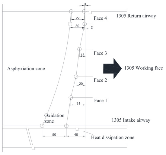 Figure 9. The “three zone” of spontaneous combustion of the 1305 working face.