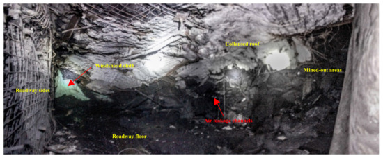 Although the shortest period of spontaneous combustion of the working face is 37 days, a coal mining operation would be safe at a minimum speed of 1.35 m/d. However, there were problems, such as too much CO left and severe loss of air at the end of the working face, resulting from large air leakage channels formed largely due to the slow collapse of the roof in the two ends of the working face, as is shown in Figure 10. The air in the working face would get into the mined-out areas through the channels, leading to the spontaneous combustion of the residual. Therefore, it is exceedingly necessary to take measures to prevent such potential problems from happening. Usually, the measure for the prevention of such problems is plugging the channels with a windshield cloth or with bricks. Plugging the channels with the former is easy, yet with poor effect, and its plugging effect is deeply influenced by the roof collapse. Plugging the channels by using the bricks put people operating in danger, and there is great possibility for the bricks to collapse, leading to air leakage channels again. In a word, either way of plugging the channels has limitations. Therefore, the FBLPG is used to achieve the purpose of this study.