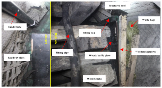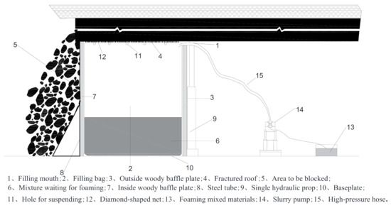 The procedure of roof-adaptive end filling technology is very easy, with low dependence on devices and is moveable with convenience. Its working principle can be seen in Figure 11. The whole setup consists of three parts: the supporting part, filling bag part and pumping equipment. The supporting part is composed of a triangle supporting platform and a woody baffle plate, providing stability of the filling bag at the end near the mined-out areas. The filling bag serves as a mold for the FBLPG slurry. The pumping equipment consists of an iron mixing cylinder, an HBMD 80 filling pump designed for mining and a high-pressure rubber tube with a maximum pressure bearing of 4 MPa, which is used for the preparation of FBLPG and pumping. It needs to be noted that the upper end of the filling bag is not sealed, ensuring full contact of FBLPG with the roof when it is foaming and expanding, and thus it would become the perfect filling body that fits the space of the channels.