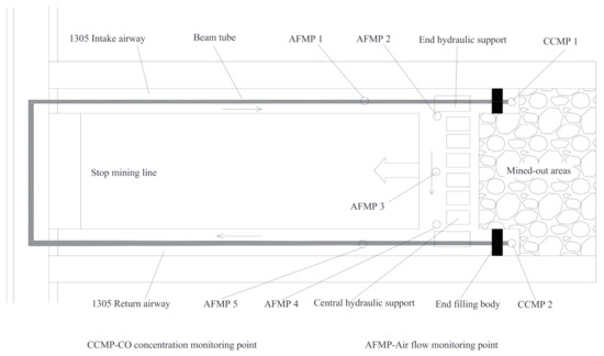 The main purpose of plugging the channel end is to prevent the fresh air from going into the mined-out areas. Otherwise, the residual coals in the areas would be oxidized, producing toxic CO, which would accumulate at the end and poses danger to the operation of the mining in the working face. In addition, the large size channels resulting from the collapse of the end would lead to the air loss and thus cause airflow loss. Therefore, CO concentration and the airflow were selected as the two key indicators for the evaluation of the plugging and filling effect. The monitoring point for CO concentration was set at the end of the working face, and the collection of and concentration testing of CO were done through the JSG-7 monitoring system. The airflow speed was measured through the DFA-IV airflow meter by the means of a four-line method. Then, the section areas of the monitoring points in the roadway were measured. Through calculation, the airflow of the monitoring points can be obtained. The arrangement of the monitoring points for the CO concentration and airflow is shown in Figure 13.