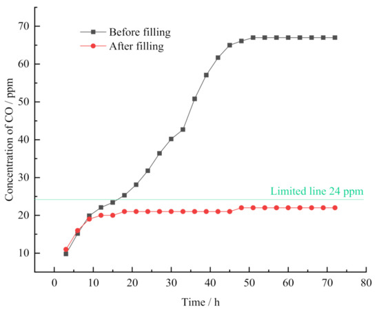 Figure 14. The variation trend of CO concentration in the roadway end before and after the filling operation.