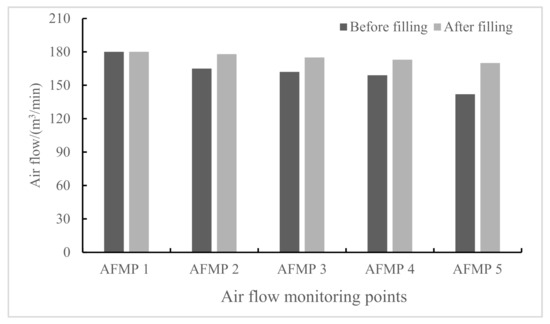 Figure 15. The variation in the airflow in the monitoring points of the working face before and after filling.