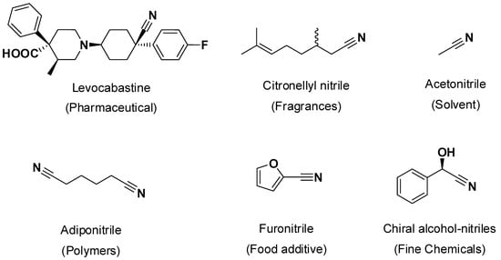 Nitriles comprise an important group of chemicals that are widely spread in industry in a broad range of sectors, being used as products, solvents, polymers, commodities, or as starting materials for the production of other chemicals such as amines, amides, etc. (Figure 1). A nitrile group (–C≡N) displays a linear geometry with sp hybridization of the triple bond. Depending on the application, their annual production may range from kilo scale low-volume, high-value applied to pharmaceuticals and fine chemicals, to millions of tons worldwide for solvents and commodities [1,2,3]. Several synthetic routes have been proposed for the industrial production of nitriles, typically starting from petroleum-based alkenes (e.g., ethene, butadiene), and proceeding via hydrocyanation (using hazardous (hydrogen) cyanide), or via ammonoxidation (using ammonia and alkanes), or via amide dehydration [1,2,3]. These syntheses have been successfully established at a commercial level and largely optimized over decades.
